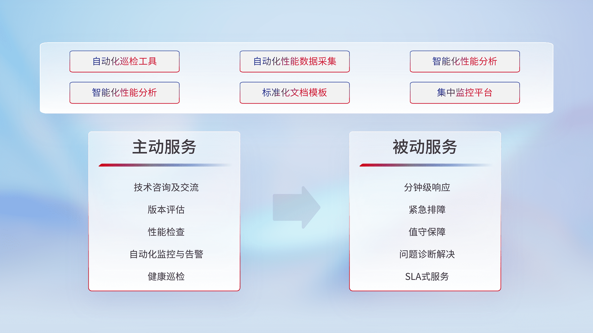 智能化工具和标准化文档,,保障服务质量,,提供主动服务(包含技术咨询、、、、版本评估、、性能检查、、、自动化监控与告警、、、健康巡检)和被动服务包含(分钟级响应、、、、紧急排障、、、、值守保障、、、问题诊断解决、、SLA服务)。。